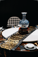 大幅蜀錦刺繡墻,像一幅古樸畫卷栩栩展開。綠松石水晶燈、現(xiàn)代千鳥格布藝、大理石天花和墻面…整個(gè)空間視覺碰撞感強(qiáng)烈~